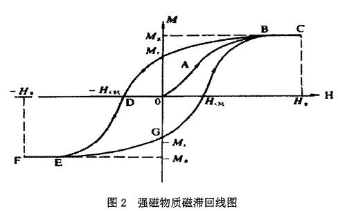 从图2(强磁物质磁滞回线)分析得出,当励磁电缆中通过电流时,在周围感应出磁场,磁开关中的铁质簧片被磁化,一定时间后达到饱和状态。机组停机后,励磁电缆中电流消失,周围磁场开始减弱,磁开关中的铁质簧片也开始退磁,如图2可看出,当周围磁场减小到0时,磁滞回线中因为矫顽力的存在,铁质簧片的磁性并没有完全消失,所以磁开关误动作的信号不会复归。此时需要在磁开关附近用永久磁铁产生一个与原磁场方向相反的磁场,使矫顽力相互抵消,铁质簧片中的磁性消失,磁开关误动作信号复归。