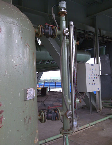 在液位计立管上由用户设定上、下限位置安装控制器,控制器内带有自保持作用的舌黄开关,利用磁性浮子随液位移动使黄片开关动作时,实现报警或限位控制。