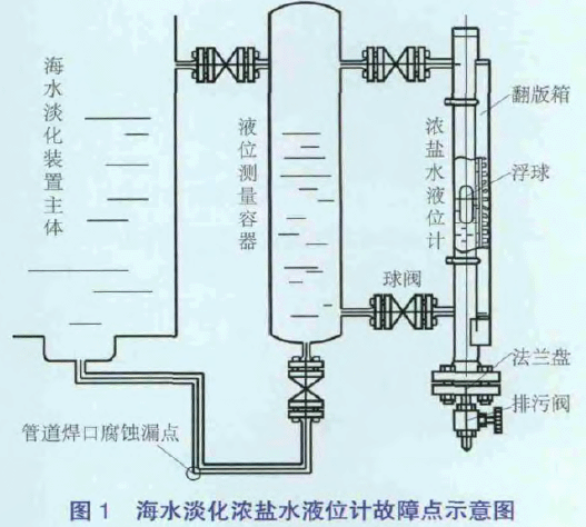 *钢京唐钢铁公司带热压缩器低温多效蒸馏海水淡化的浓盐水、蒸馏水及冷凝水液位测量都采用带远传的防腐磁翻板液位计。为了防止结垢,需在低温的情况下让海水达到沸点,要求海水淡化装置内部处于负压状态,正常运行时为-0.093MPa左右。现将磁翻板液位计在负压状态下发生管路漏气的典型故障进行分析。
