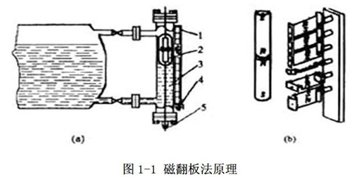 磁翻板液位计带远传原理如图1—1a所示,1-翻板指示组件;2-浮子;3-连通管组件;4-调整螺钉;5-放泄塞。浮子装有一组永久磁铁,随液位变化而上下移动,通过磁耦合作用带动磁翻板组件翻转。当液位上升时,磁翻板的红色面朝外;液位下降时,白色面朝外。故根据磁翻板的颜色即可确定液位。浮子内磁铁与磁翻板磁性结构如图1—1b所示,每片翻板间的距离一般为10 mm。采用几台磁翻板装置串联可增大量程。