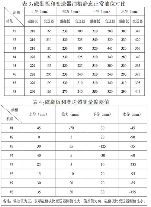 从表3,可以看出磁翻板油槽油位与监控变送器测量值存在偏差,具体偏差值见表4: