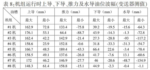 从表8可以看出,上导波幅均在静态油位以上,容易出现高油位报警;推力和下导油槽油槽波幅均上下跨越静态油位,容易出现高油位、低油位报警;水导油槽波幅在静态油位以下,容易出现低油位报警。