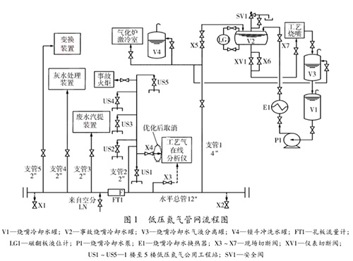 (1) 通过对低压氮气管网的分析、排查得知,V2出水阀门(X6、XV1)内漏导致V2满液后水经X5阀进入了低压氮气水平总管,使氮气露点升高。