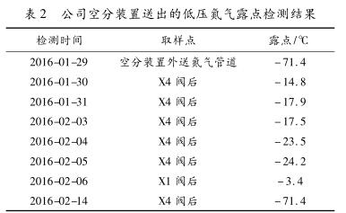 2016年2月14日在X4阀处检测氮气的露点为-71.4℃,与空分装置外送氮气的露点一样,表明低压氮气管网中的水已经完全排出。