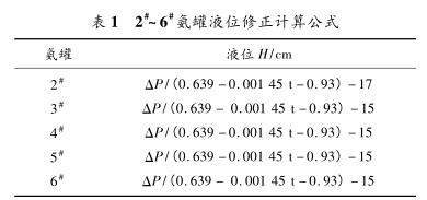 因液氨密度受温度影响大,且每个氨罐的保温效果也有差异,故如需准确测量氨罐液位,必须引入温度测量。对2#~6#氨罐分别进行卸压,并引入热电偶远传至DCS系统,对密度进行修正,修正公式为Q液=0.639-0.00145t。经过以上修正,2#~6#氨罐液位修正计算公式如表1所示。