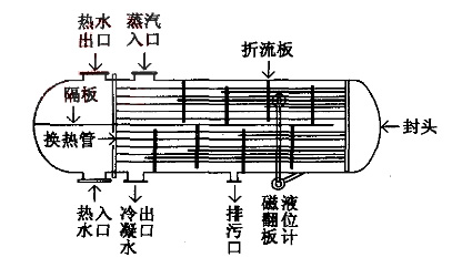 如下图所示,压力为0.4~0.6MPa的饱和蒸汽由蒸汽入口进入管式换热器,经折流板、隔板上下流通,*终其大部分热量被热水吸收,形成凝结水从凝结水出口流出。一次热水(温度约为20℃)从热水入口流进,经过从左向右的换热管流至封头,在经过从右向左的换热管从热水出口流出,变成二次热水,二次热水流向系统,放热后流回换热站循环水泵入口,经加压后再次流向热水入口,如此反复循环加热,*终向用户提供80~130℃的高温热水。