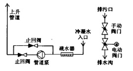 5.1如上图所示,在原上升管道与疏水器之间增加两条回路,其中主路由止回阀、管道泵组成。管道泵与换热器的三畅磁翻板液位计连锁,根据现场具体运行情况设置高、低液位管道泵自动启停,磁翻板液位计的数值上传至厂区指挥中心,实时远程监控,同时增设管道泵的紧急停止按钮。旁路仅设置止回阀。在正常情况下,凝结水可以通过旁路的止回阀顺利地回收到凝结水回收装置中;在非正常情况下,则可以凭借管道泵加压后,顺利回收。