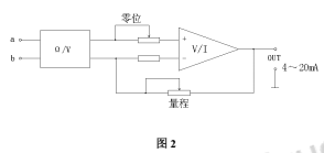 来自液位传感器的对应液位高度的电阻信号,进入图2所示的a,b端,经处理后*终输出4~20mA DC标准信号。