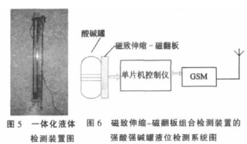 目前,工业用浓酸、浓碱液罐内的液位检测手段,主要有超声波液位检测仪、磁翻板液位计、接触式防腐蚀液位检测装置等。2007年05月,作者参观了山西省阳城电厂,对阳城电厂的酸碱罐液位检测装置进行了考察;该厂现有大小20余个酸碱罐中酸碱液位的检测,大都采用超声波液位计与磁翻板液位计相结合的方式。超声波液位计对酸碱液位信息通过线路传输到计算机,进行实时观测。但据该厂技术人员介绍,超声波液位计有一个致命缺点,就是安装在罐顶部的超声波探头很容易被酸雾或碱雾笼罩,严重影响了测量准确度,需要工作人员定时对超声波探头进行清洗。磁翻板液位计没有数据的自动传输功能,需要工作人员定时地去观察液位刻度。为了确保酸碱液位数据的可靠性,该厂技术人员提出增加一套液位检测装置的要求,并能实现数据的自动化远程传输。为此,作者利用磁致伸缩传感器和磁翻板相结合的办法,以求实现酸碱液位的非接触式测量,并利用单片机和GSM技术,实现磁致伸缩液位信号的无线传输。