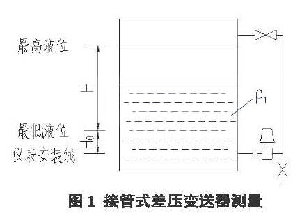 图1中,P 1为介质密度,H。为液位起始点。差压变送器与液体导管为水平安装,只要确定气相管内无冷凝液,当液位密度稳定时,即可准确测量液体的高度。但在液氨储罐的液位测量过程中,气相管内的气氨会随环境瘟度的变化而冷凝,产生压差,故这种接管式的差压测量方法不适用于液氮储罐的测量。
