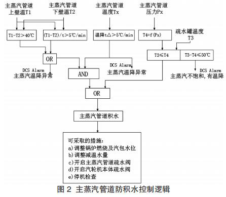 结合主蒸汽管道积水的上下壁温差法与疏水罐测温法结合自动检测方法, 主蒸汽管道防积水可以采用如图 2 所示中的控制逻辑与策略。