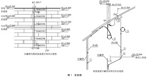 以昆仑能源华油天然气四川广安液化天然气2万方储罐为例,在安装多点温度计过程中,内罐底部温度热电阻需要从内罐浮顶进入罐内,沿罐壁垂直向下固定在罐底部。如需夹层底部温度测量,则需要将温度热电阻沿外罐壁垂直而下,固定在罐底夹层的氮气管上,每间隔4m布置1个电缆固线器,如图1所示。