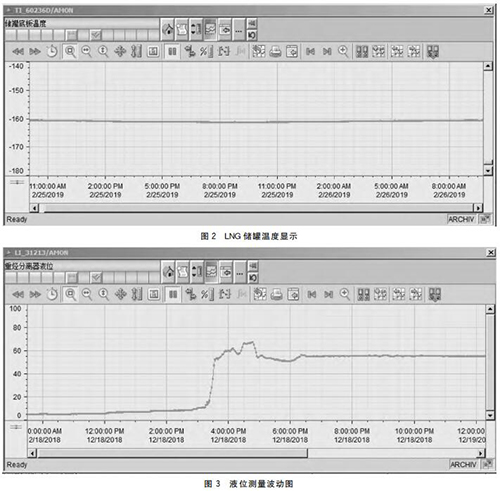 然后利用多孔法兰(结合LNG项目的实际情况来选择法兰的孔数以及尺寸大小),将其接到LNG罐顶的温度变送器接线箱内部,再使用多芯电缆把4~20mA信号发送到控制系统。现场安装RTD热电阻建议选用双支,方便以后检修更换。图2为LNG储罐温度显示。