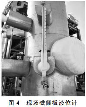 现场磁翻板液位计(图4)由于储罐压力偏高,正常生产时为3MPa,导致磁翻版液位计浮子被压扁。解决方法:寻找能够生产耐高压低密度液位计浮子厂家。