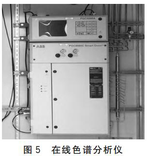 (1)利用电加热气化取样探头,把测量介质引入在线色谱分析仪,实时分析气体组分。在使用在线色谱分析仪(图5)时,需要配合标气及载气,提前对色谱进行标定。预处理部分,先把每个取样管路取下来吹扫5~10min(取样探头压力设定为2~3kg),保证没有杂质掺入,然后接上管线。要注意定期检查色谱载气(H2或者N2)使用情况,及时更换。如果更换不及时,在使用完之前,*好停用色谱,防止烧坏检测器。