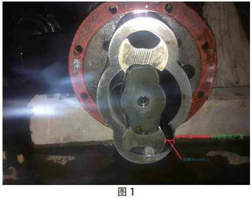 2015 年 8 月 10 日 17:50 机组在运行过程中“机组高位油箱事故低油位动作”事故停机。现场检查发现机组高位油箱油位为 60mm,低于下限值 90mm。进一步检查发现,稀油站 2# 低压油泵空转,没有打油,振动、声音较大。18:18 维护人员对 2# 低压油泵进行了抢修拆解。发现油泵从动螺杆与衬套间隙过大,达 1cm 以上,衬套磨损严重(见图 1)。油泵损坏,无法打油。