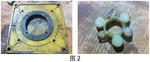2015 年 9 月 23 日运行过程中,02:15 因“机组高位油箱低油位动作”停机。现场拆解稀油站 1# 低压油泵,发现油泵与底座 2 颗连接螺栓脱落、出油管松脱、底座螺孔拉崩、螺孔周围多处裂纹、缓冲垫破损等诸多问题。造成油泵无法供油,引起停机。如图 2 所示。