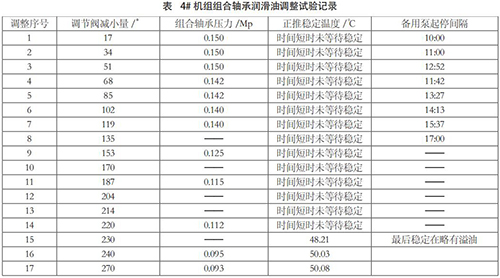 (4)方案四:调整组合轴承润滑油量经过主机制造厂设计部计算复核,认为现有油泵有可能满足冷却要求。经过与电厂沟通,联合制定了减少组合轴承用油量的试验方案。主要措施为:在组合轴承供油管调节阀后组合轴承前增加一压力表,用于监视组合轴承供油压力。机组在满负荷运行条件下,分阶段逐步调整节流阀减少供油量,监视记录组合轴承供油压力和组合轴承温度,直到单台油泵满足用油量略有余量、备用泵处于备用状态下,正向推力瓦*高温度控制 55℃以内。*后恢复单冷却器运行和环境温度*高条件下检验轴承温度。