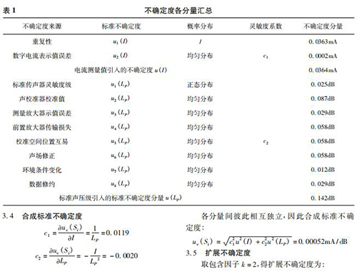 定度 u1 ( LP ) 用 B 类标准不确定度评定。根据标准传声器检定**,标准传声器声压灵敏度级在 1kHz 时的扩展不确定度为 U = 0. 05dB,k = 2,则其对应的标准不确定度为:
