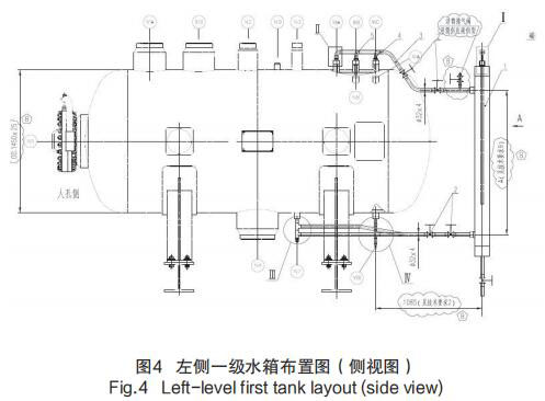 1)在每个疏水箱外部靠近水侧取压口处,安装 3 个测量筒用于导波热水箱液位计的安置以及液位测量;每个测量筒的汽侧取压口仍然选用原导波热水箱液位计接口,而水侧取压口引用原水汽取样口、磁翻板液位计取压口,以左侧一级水箱布置图为例,见图 4 左侧一级水箱布置图(侧视图)。
