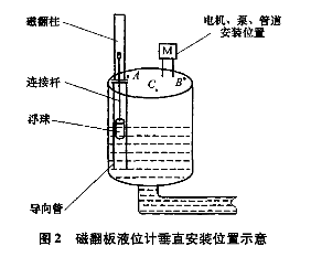 图2中,B点靠近电机和泵,衬四氟磁翻板液位计安装在此处既影响电机及泵的检修,又因泵附近液位的环流波动较大,对浮子导向管冲刷严重,故B点不合理;C点处因有管道通过,不便维护且影响管道和泵、电机等的起吊更换,故也不能选择C点;A点远离泵和电机,且有足够的空间安装翻板,便于维护,所以A点较为合适。