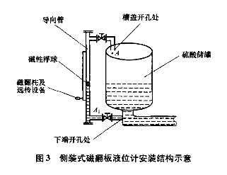 衬四氟磁翻板液位计安装位置的选择应根据该点的液位是否能真实反应酸槽实际液位。酸槽上衬四氟磁翻板液位计垂直安装位置的选择如图2所示。