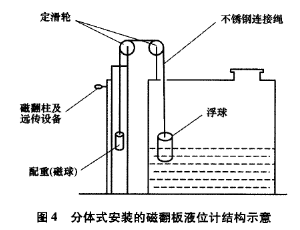 分体式衬四氟磁翻板液位计的安装步骤如下:①通过计算浮力和配重,在槽体顶部合适位置安装定滑轮,在槽外合适位子安装磁翻板传感装置;②用直径为3mm的不锈钢绳连接浮子和配重,钢绳长度根据液位来计算。这里特别要注意,磁翻板要反向安装。