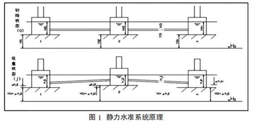 静力水准仪依据连通管的原理,采用振弦式传感器,测量每个测点 容器内液面的相对变化,再通过计算公式求得相对于基准点的沉降量,如图 1 所示。