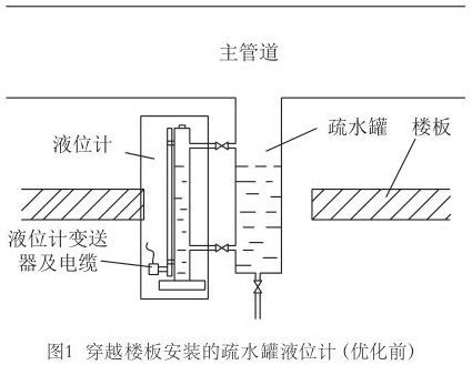 田湾核电3#、4#机组现场疏水罐液位测量*先采用两个连通管把液位计测量筒与疏水罐连通,测量筒内部含有磁浮子,磁浮子高度随疏水罐内液位变化,测量筒外部安装测量杆,感受磁浮子高度,再通过下部变送器转化成电流信号输出到DCS系统。一些蒸汽管道安装布置贴近地面,疏水罐穿越楼板,这样就使液位计安装后变送器位于楼板下部,即下一层厂房的房顶;如图1所示。