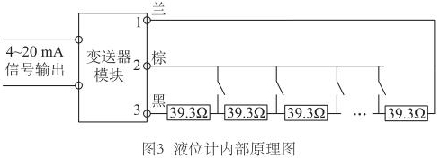 为寻求更好的改进方案,对氨水液位计的测量原理进行了深入研究。液位计测量杆中是由等间距排布的干簧管和电阻元件组成,当磁浮子达到某一高度时,对应的干簧管闭合,如果能识别出哪个干簧管闭合,即可获得当前液位值。那么变送器又是如何识别出哪个干簧管闭合的呢?再次探究测量杆内部电路,绘制液位计内部原理图,如图3所示。测量杆内部电阻串联连接,每两个电阻的连接处连接干簧管的一端,干簧管的另一端并联连接,*终引出兰、棕、黑三根信号线。