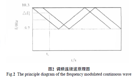 如果设定雷达波发射频率**间线性增加,增加的斜率为k,当遇到液面发生反射时,反射回来的信号比发射信号滞后了一定时间t。根据电磁波传播原理可知:t=2R/C (6)