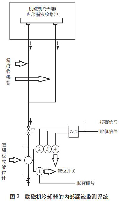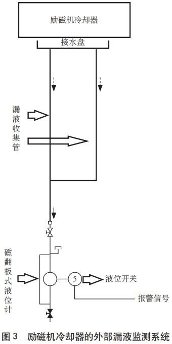 实际运行经验表明,防冻液位计内部铜管发生泄漏的概率较低,但一旦发生泄漏,漏液会随着冷却空气沿闭合风路进入励磁机内部,造成励磁机短路损坏的严重后果。为了保证机组安全,应有冷却器内部铜管泄漏监测装置,然而现场没有配置此类装置。