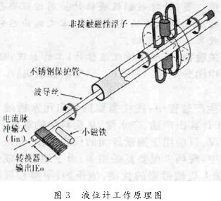 其工作原理是利用磁场脉冲波,测量时液位计的头部发出电流“询问脉冲”,此脉冲同时产生磁场,沿波导管内的感应线向下运行,在液位计管外配有浮子,浮子可随液位沿侧杆上下移动,浮子内设有一组永久磁铁,其磁场与脉冲产生的磁场相遇则产生一个新的变化磁场,随之产生新的电磁“返回脉冲”,测定“询问脉冲”和“返回脉冲”的周期便可知道液位的变化。因此,磁致式液位计是以浮子为测量元件通过磁耦合的变化传递到指示器,使指示器能够清晰地指示出液位的高度。