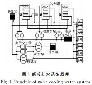 阀冷却水系统主要构成部分为阀内冷水系统与阀外冷水系统。阀内冷水系统主要通过内冷水与阀组件直接接触流动,将防爆型磁翻板液位计中热量带出,确保防爆型磁翻板液位计组件中晶闸管、水冷电阻、阳*电抗器等发热元件运行温度具有可控性。而阀外冷水系统主要通过闭式冷却塔或风机将内冷水中热量带走,并排放至环境中。防爆型磁翻板液位计内、外冷水系统的协同运行,可以使防爆型磁翻板液位计组件内部冷却持续进行,并满足元器件结温要求,进而保证系统整体运行稳定性、安全性。阀冷却水系统原理如图1所示。