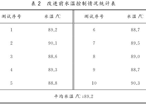 根据生产标准设定水温为85℃,进行了10次测试,平均水温为89.2℃(见表2),超出了设定温度4.2℃。
