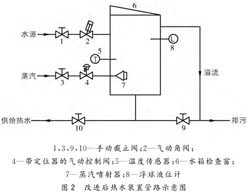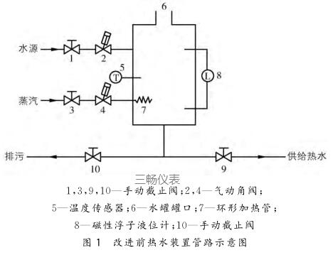 改进后的热水装置主要由水源、蒸汽源、带定位器的气动控制阀、手动截止阀、蒸汽喷射器、温度传感器、浮球液位计、水箱以及溢流管路等组成。其工作过程为: