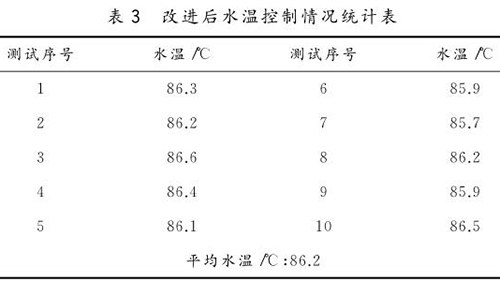 热水装置改进完成后,*大地降低了由其引发的设备故障,到目前为止未发生一次设备故障;降低了加热元件工作时水箱的震动和噪声;提高了水温的控制精度。在设定水温为85℃情况下,进行了10次测试,平均水温为86.2℃(表3),水温的波动情况由改进前4.2℃降低到1.2℃。