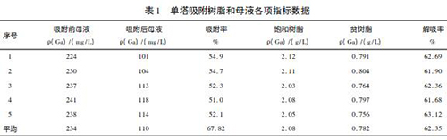 (1) 技改原理: 新树脂入厂检验,饱和树脂容量可以达到 2. 5 ~ 2. 8g /L。但在实际生产中由于含液位计母液的通过量不足,造成树脂的吸附率较低,新树脂饱和树脂容量一般在 2. 0 ~ 2. 2g /L 之间。通过再增加一组吸附塔来进行双塔吸附,即提高了树脂利用率,又充分利用了母液,提高树脂的饱和度。采用双塔交叉吸附工艺的升级改造,是在原有单塔吸附的基础上增加一个吸附塔和一台母液进塔泵。两台母液进塔泵分别向两个吸附塔同时供液树脂吸附饱和后,两个吸附塔树脂交叉进行下步解吸工艺。表 1为单塔吸附工艺生产中取用的一组数。