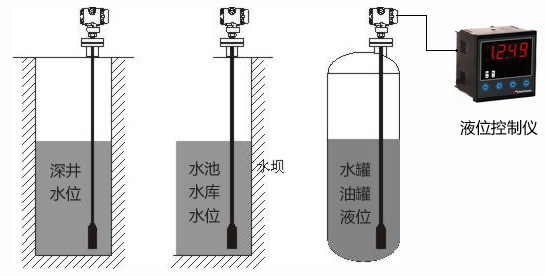 液位计应安装在静止的深井、水池中时,通常把内径Φ45mm左右的钢管(不同高度打若干小孔,以便水通畅进入管内)固定于水中,然后将静压投入式液位计放入钢管中即可使用。变送器的安装方向为垂直,投入式安装位置应远离液体出入口及搅拌器。在有较大振动的使用场合,可在变送器上缠绕钢丝,利用钢丝减震,以免拉断电缆线。测量流动或有搅拌的液体的液位时,通常把内径Φ45mm左右的钢管(在液体流向的反面不同高度打若干小孔,以便水通畅进入管内)固定于水中,然后将静压投入式液位计放入钢管中即可使用。 湿度传感器探头 , , 不锈钢电热管 PT100 传感器 , , 下图为不同工况下的投入式液位计的安装方式: