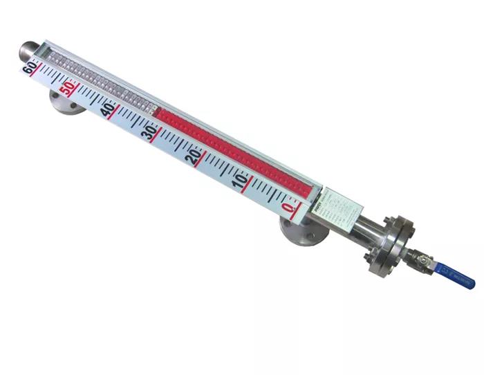 磁性浮子液位计是基于连通器和磁性耦合原理实现液位实时测量的。当被测容器中的液位升降时,浮筒内的磁性浮子也随之升降,浮子内的永久磁钢通过磁性耦合驱动浮筒外部的磁性翻片翻转180°,翻片两面分别涂有不同的颜色(通常为红色和白色),以指示液位的位置。一般地,当容器内液位上升时,翻片由白色转变为红色,当容器内液位下降时,翻片由红色转变为白色,指示器的红白交界处即为容器内液位的实际高度,从而实现液位的准确测量。