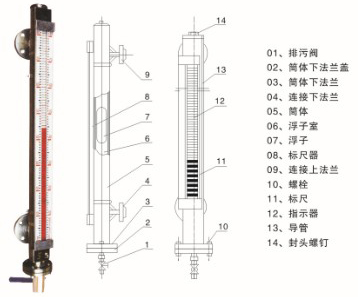 液位计根据浮力原理,浮子在测量管内随液位的升降而上下移动,浮子内的永久磁钢通过磁耦合作用,驱动红、白色翻柱翻转180’液位上升时,翻柱由白色转为红色,下降时,翻柱由红色转为白色,从而实现液位的指示。