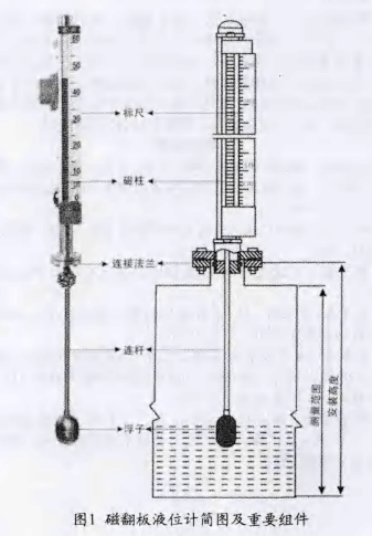 侧装磁翻板液位计是根据国内外同类产品加以消化提高且按照原化工部颁布的磁浮子液位计标准HG/T21584-95研制生产的产品。按照其安装位置,侧装磁翻板液位计可以分为顶装型和侧装型两类。目前,托甫台区块密闭流程采用的是无护管顶装型液位计(U11Z221/D-2400),23口单井密闭流程中共一计使用87个。侧装磁翻板液位计主要利用阿基米德浮力原理和磁耦合原理设计而成,它的主要组成部分包括磁浮子、连杆、磁性头、磁柱以及面板标尺等(图1),磁柱正反两面分别为红色和白色,主要用于指示液面位置。液位计正常工作时,磁浮子一半体积浸没在液体中,呈漂浮状态,并且随着液面的升降而同时升降。当液面上升时,磁浮子带动连杆上的磁性头向上运动,磁性头与面板内的磁柱发生物理反应,产生扭矩,促使磁柱发生180°的翻转,即由白色转变为红色;当液面下降时,根据相同的原理,磁柱由红色翻转为白色。因此,显示面板上磁柱红色和白色的分界线就指示了容器内待测液体的液面位置。