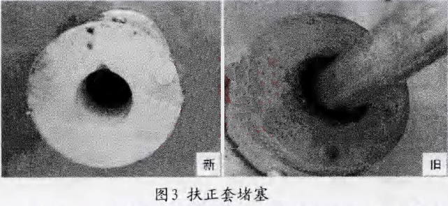 扶正套的材料为塑料,在连杆的上下反复运动过程中,易将砂粒及稠油带至扶正套处,造成孔眼堵塞(图3),进而阻碍了连杆的上下活动,导致液位计无法根据现场实际液位变化瞬时复原,形成假液位,测量不准确。