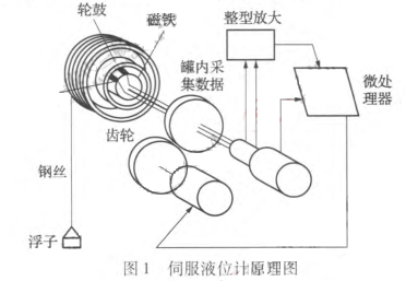 伺服液位计具有智能性、高精度等优点。从前文的分类角度而言,伺服液位计属于接触式、力学原理类的智能液位计。它的工作原理是基于浮力平衡原理,由微型伺服电机连接细钢丝驱动体积较小的浮子,形成一个闭环反馈系统,如图1所示。当液位计工作时,浮子自身产生的重力作用于细钢丝上,在外轮鼓产生力矩,从而引起磁通量的变化,磁通量的变化将导致电磁传感器的输出电压信号发生变化。将电压值与存储于CPU中的参考电压进行比较,当达到浮力平衡时,电压差值为零。此时测量缠绕在轮鼓上细钢丝所经历的长度变化,得出液位变化情况,由于轮鼓对钢丝的测量分辨率很小,从而使得伺服液位计能够达到±1mm左右的精确度。