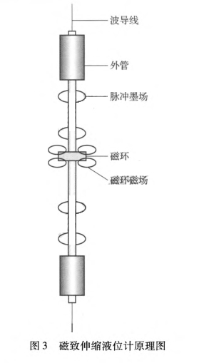 磁致伸缩液位计是根据磁致伸缩原理进行工作的液位计,具体工作原理:在非磁性的波导管内安装一根磁致波导线,波导管外部安装有随液面进行上下运动的磁性浮子,在磁致波导线的其中一端装有压磁传感器,传感器在每个时间单位发出一定数量的电流脉冲信号,此信号沿着磁致波导线向下传送,从而产生一个向下运动的磁环磁场,该磁环磁场同磁性浮子的磁场相互作用,从而产生一个脉冲磁场,脉冲以已知速度沿磁致波导线运动,并被压磁传感器接收,通过计算起始电流脉冲和返回脉冲的时间间隔得出浮子的位置,如图3所示。