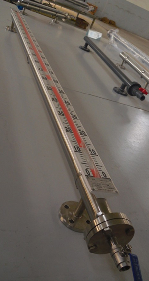 根据浮力原理,浮子在测量管内随液位的升降而上、下移动,浮子内的永久磁钢通过耦合作用,驱动红、白色翻柱翻转180°,液位上升时翻柱由白色转为红色,下降时由红色转为白色,从而实现液位指示。